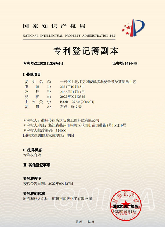 衢州傳祺新材料科技有限公司是衢州市聞天化工有限公司的下屬企業(yè);衢州市聞天化工有限公司成立于2003年,是國內(nèi)最早研發(fā)、生產(chǎn)氟碳涂料的企業(yè)之一。衢州傳祺新材料科技有限公司成立于2017年,公司專注于高分子氟材料的開發(fā)和含氟材料在防腐、防水領域的應用。經(jīng)過6年的不懈努力,已獲得了化工和建筑領域六項國家發(fā)明專利授權和兩項新產(chǎn)品科技成果獎,參與了中國建筑材料流通協(xié)會《房屋修繕防水工程規(guī)范》標準的編制工作,中建協(xié)涂裝委員會浙西工作站設立在我公司。